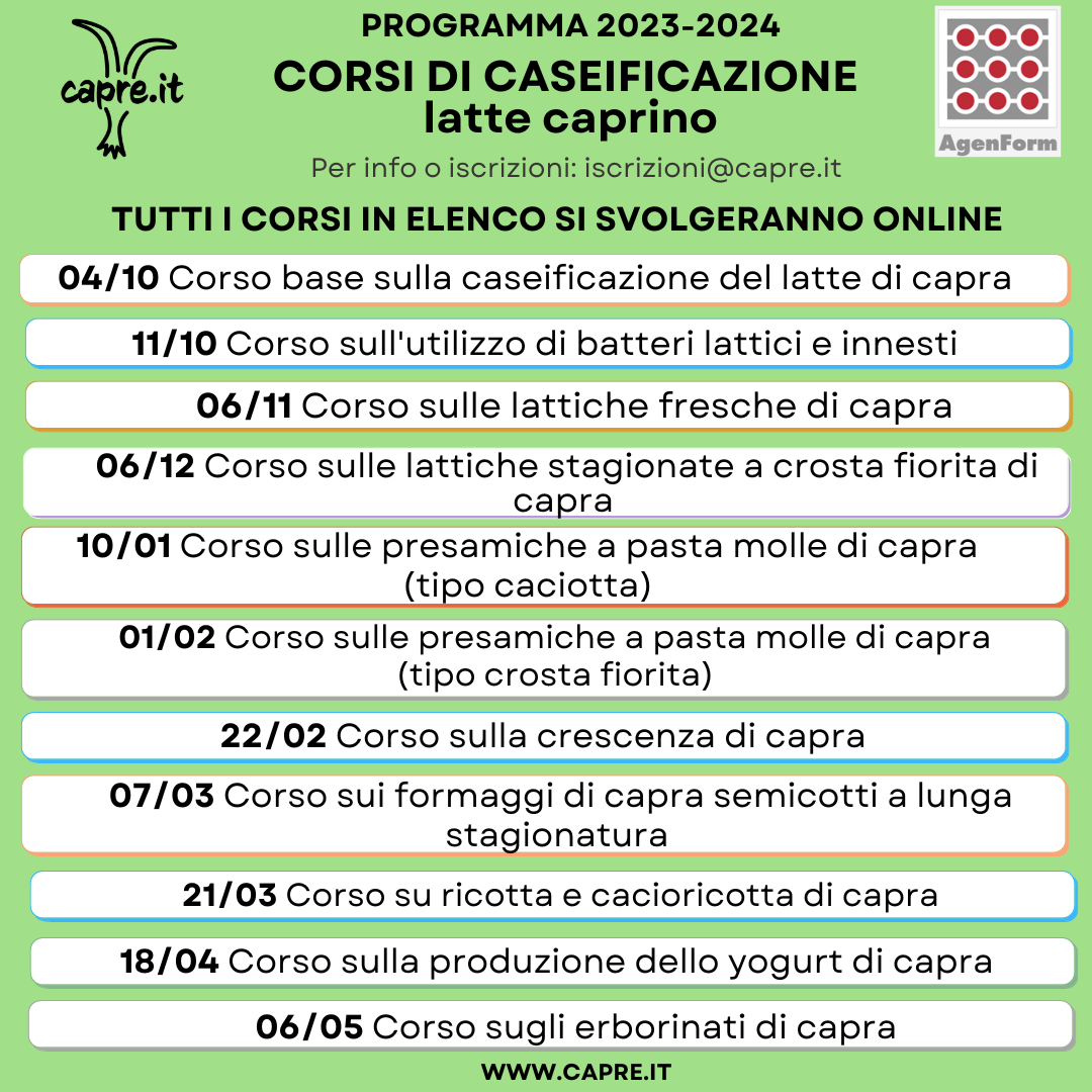 Ecco la nostra programmazione 2023/2024 per i corsi ONLINE di trasformazione del latte di capra!