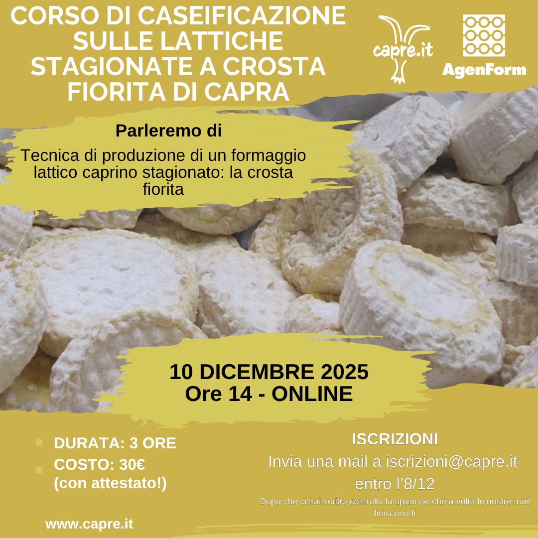 Il 10 dicembre in collaborazione con AgenForm Consorzio proponiamo online il CORSO SULLE LATTICHE STAGIONATE DI CAPRA A CROSTA FIORITA.