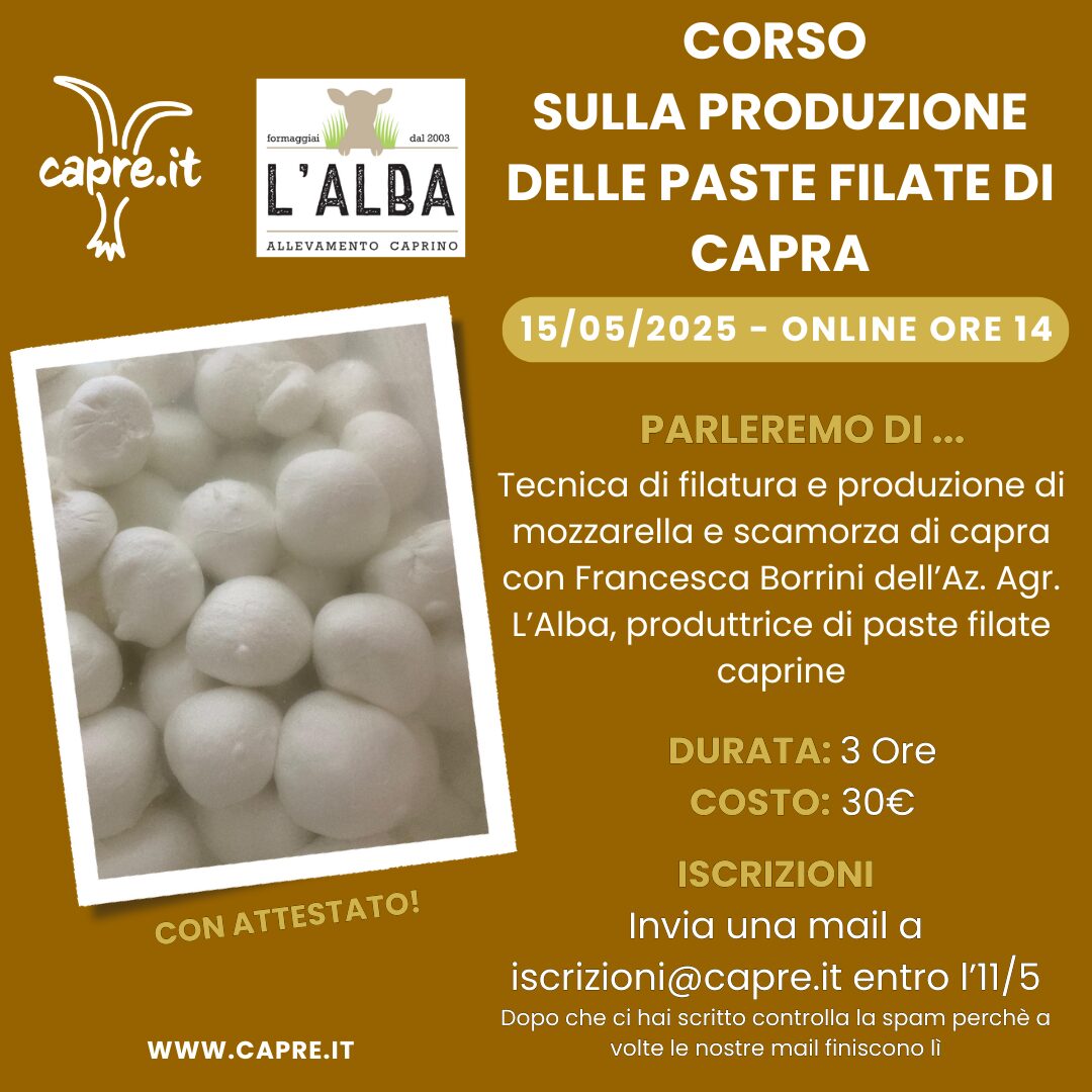 Il 15 maggio alle ore 14, proponiamo online il CORSO SULLA PRODUZIONE DELLE PASTE FILATE DI CAPRA!