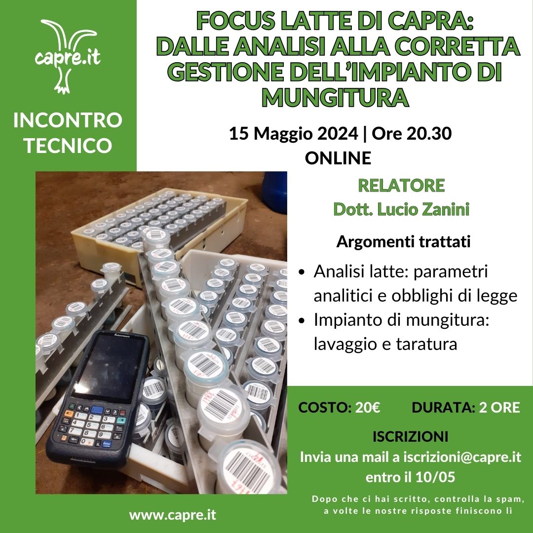 Il 15 maggio 2024 alle ore 20.30 proponiamo un INCONTRO TECNICO ONLINE dal titolo FOCUS LATTE DI CAPRA: DALLE ANALISI ALLA CORRETTA GESTIONE DELL’IMPIANTO DI MUNGITURA.