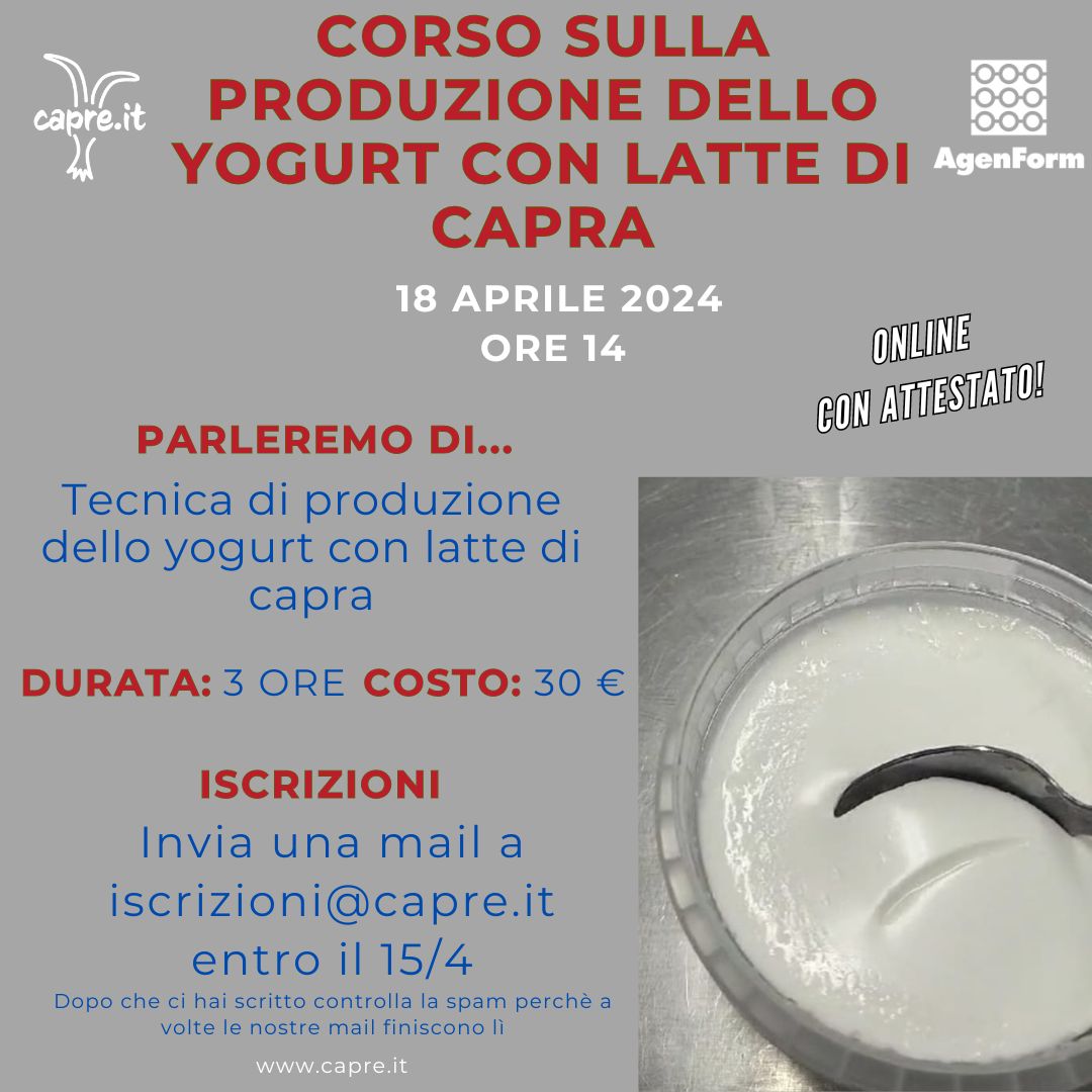 Il 18 aprile in collaborazione con AgenForm proponiamo online il CORSO SULLA PRODUZIONE DELLO YOGURT CON LATTE DI CAPRA.
