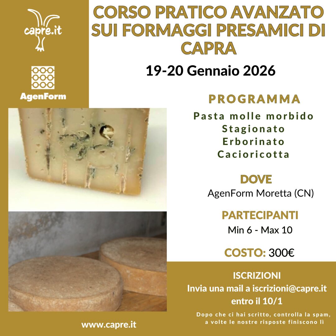 Il 19-20 gennaio 2026 in collaborazione con AgenForm Consorzio, proponiamo il CORSO PRATICO AVANZATO SUI FORMAGGI PRESAMICI DI CAPRA!