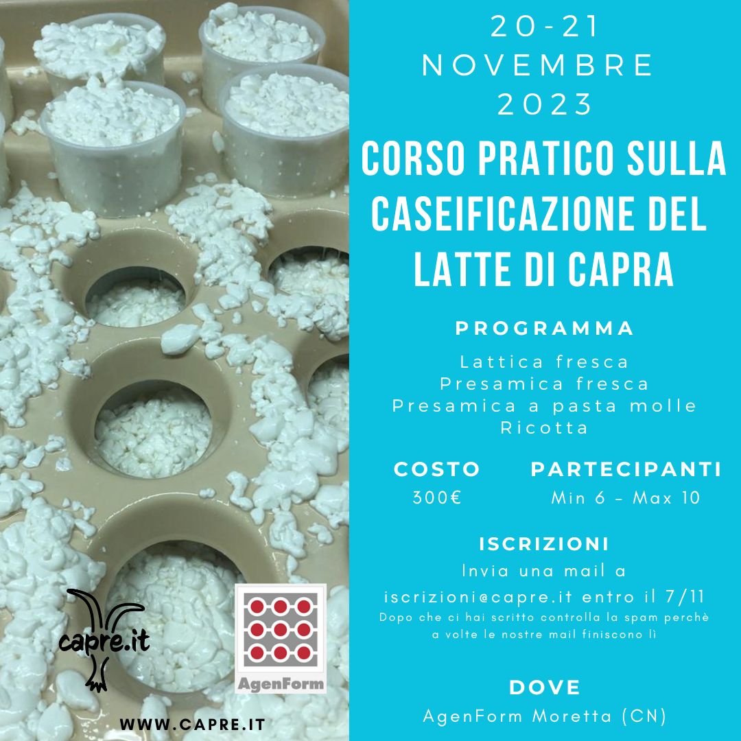Dopo il successo delle passate edizioni, il 20 e 21 novembre proponiamo, in collaborazione con AgenForm, il CORSO PRATICO SULLA CASEIFICAZIONE DEL LATTE DI CAPRA.