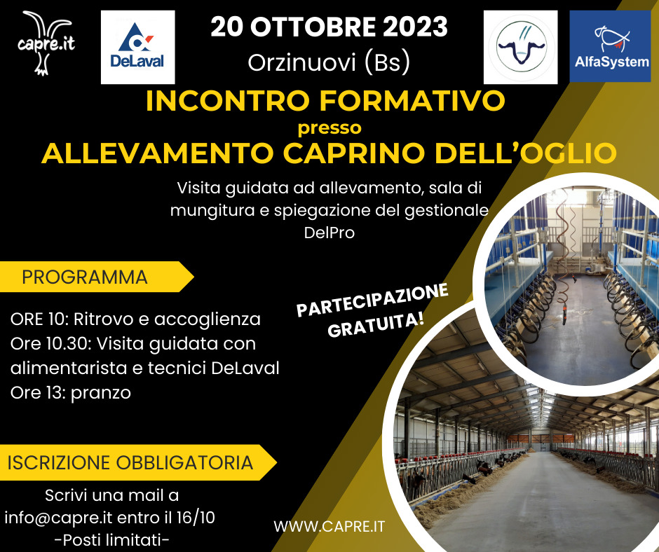 Il 20 ottobre in collaborazione con DeLaval e Alfa System, abbiamo il piacere di invitarvi all’incontro formativo che si terrà presso l’Allevamento Caprino dell’Oglio di Giulio Tolasi a Orzinuovi (BS).