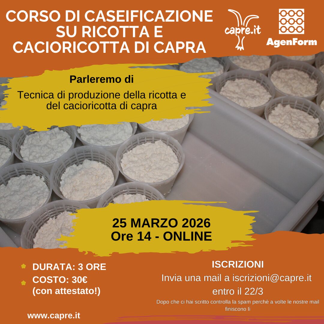 Il 25 marzo alle ore 14 terremo ONLINE il corso sulla ricotta e sulla cacioricotta di capra, in collaborazione con AgenForm Consorzio.