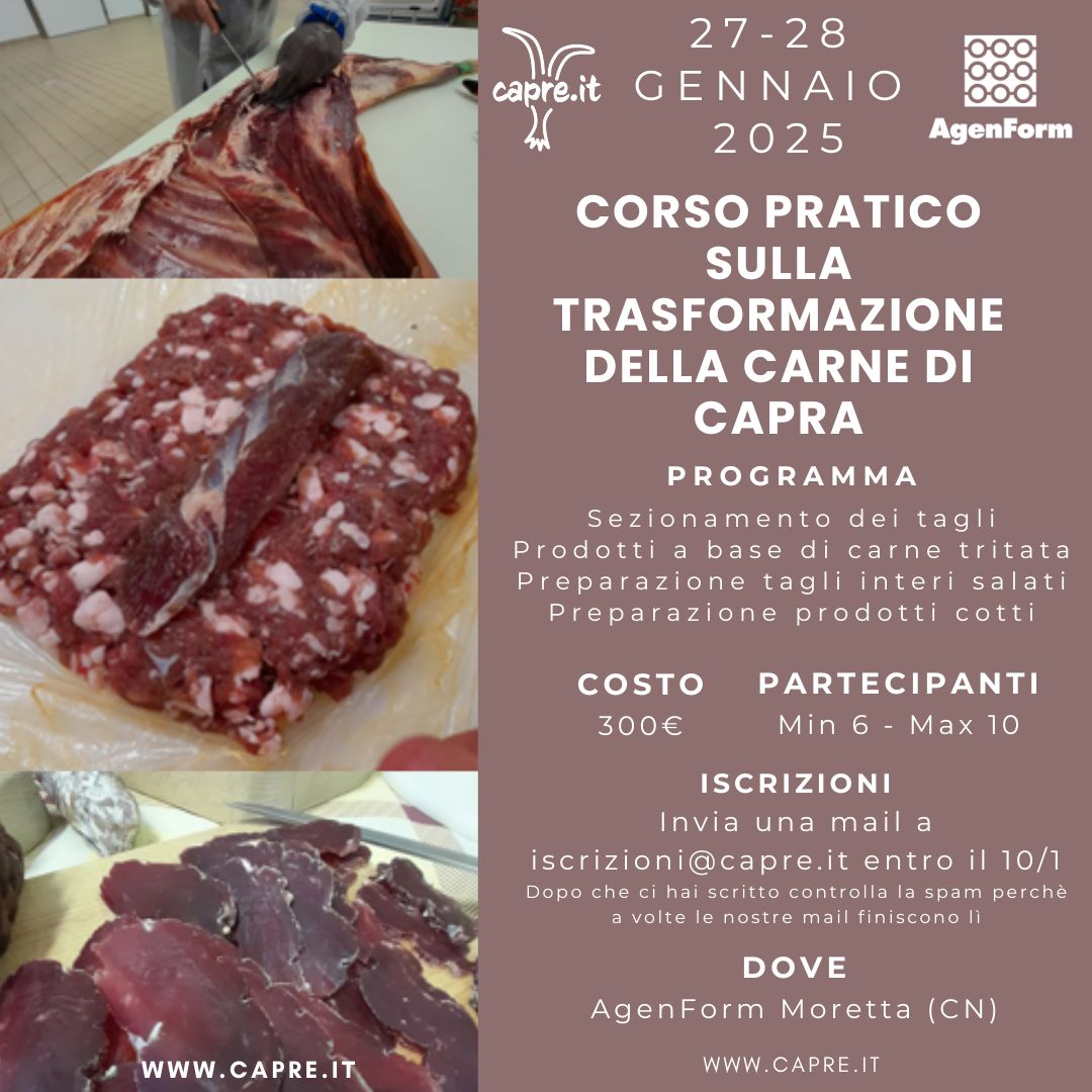 Torna una nuova edizione del CORSO PRATICO SULLA TRASFORMAZIONE DELLA CARNE DI CAPRA in collaborazione con AgenForm !!