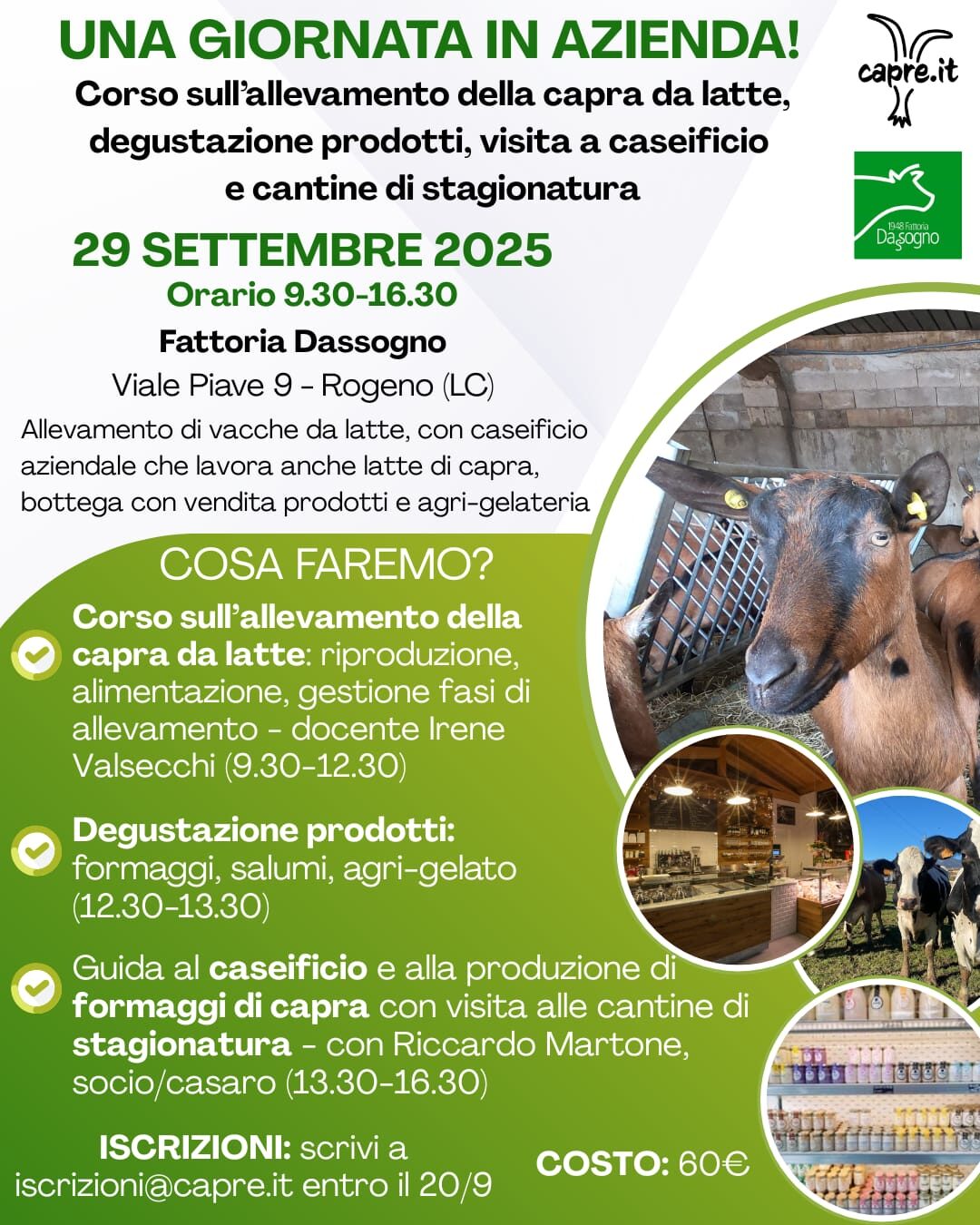 La giornata prevede il corso base sull’allevamento della capra da latte con la dott.ssa Irene Valsecchi, una degustazione dei loro buonissimi prodotti (formaggi, salumi e gelato) e nel pomeriggio, accompagnati da uno dei titolari Riccardo Martone, visita al caseificio con spiegazione delle tecniche produttive e alle cantine di stagionatura.