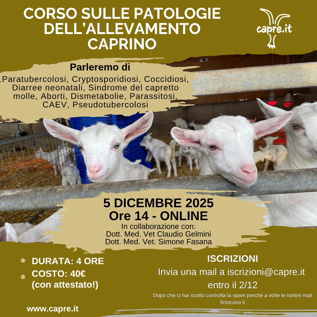 Il 5 dicembre proponiamo in collaborazione con i Med. Vet. Dott. Claudio Gelmini e Dott. Simone Fasana il CORSO SULLE PATOLOGIE DELL’ALLEVAMENTO CAPRINO.