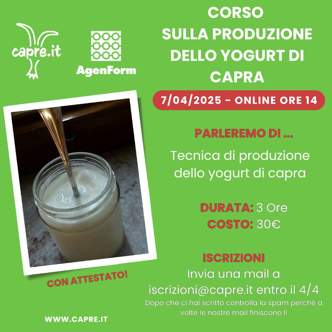 Il 7/4 in collaborazione con AgenForm proponiamo online il CORSO SULLA PRODUZIONE DELLO YOGURT DI CAPRA.