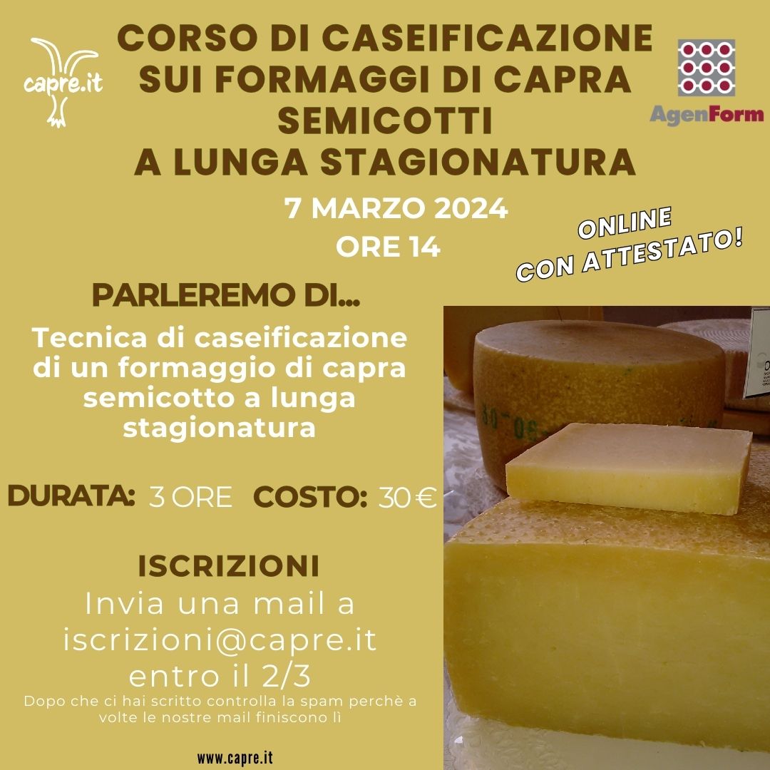Il 7 marzo in collaborazione con AgenForm proponiamo online il CORSO DI CASEIFICAZIONE SUI FORMAGGI DI CAPRA SEMICOTTI A LUNGA STAGIONATURA.
