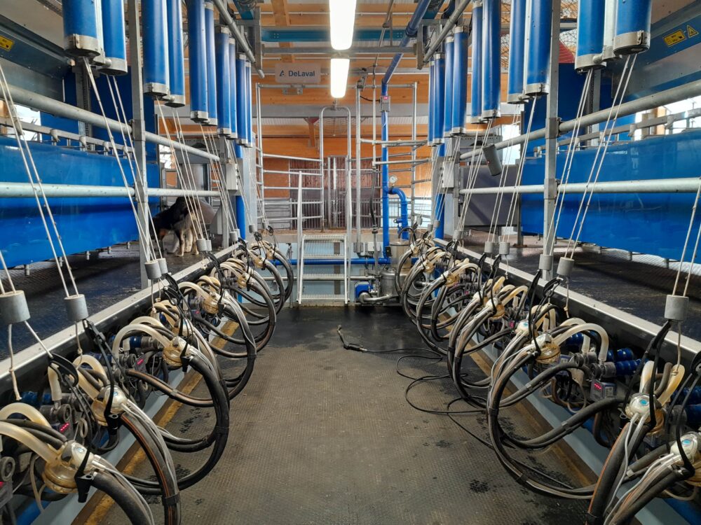 La sala di mungitura è una DeLaval da 24 poste con 24 stacchi automatici a flusso, riconoscimento elettronico degli animali e misuratore sul singolo capo della quantità di latte prodotto. Ha inoltre un’impostazione che permette a fine mungitura di svuotare completamente l’impianto di latte, dirigendo tutti i residui verso il frigo da 80q.li.