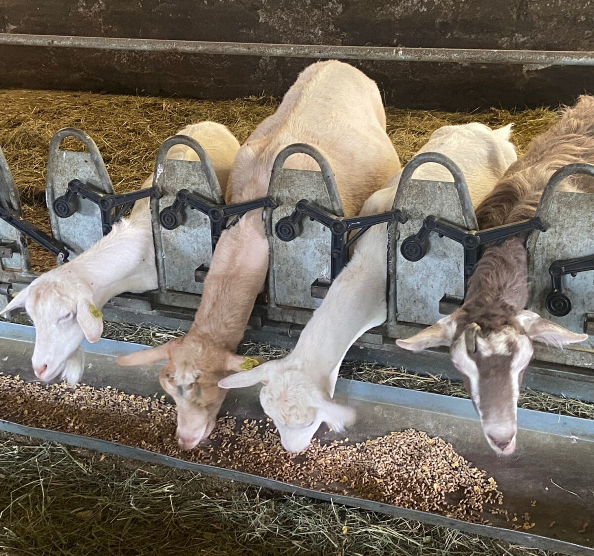 La mungitura avviene, per entrambe le specie, con mungitrice a carrello. L’alimentazione consiste in fieno di primo e secondo taglio autoprodotto nei molti prati che Pietro possiede o ha in gestione, alcuni dei quali molto ripidi dove è possibile fare fieno solo manualmente. A questo aggiunge del fieno di medica al 18% di proteina e un mangime pellettato al 16% di proteina, distribuito in mungitura.