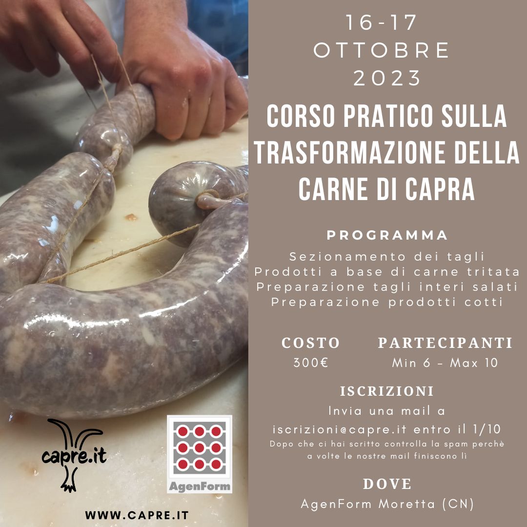 Ecco perchè, in collaborazione con AgenForm, abbiamo pensato di proporre il 16 e 17 ottobre 2023 il CORSO PRATICO SULLA TRASFORMAZIONE DELLA CARNE DI CAPRA!