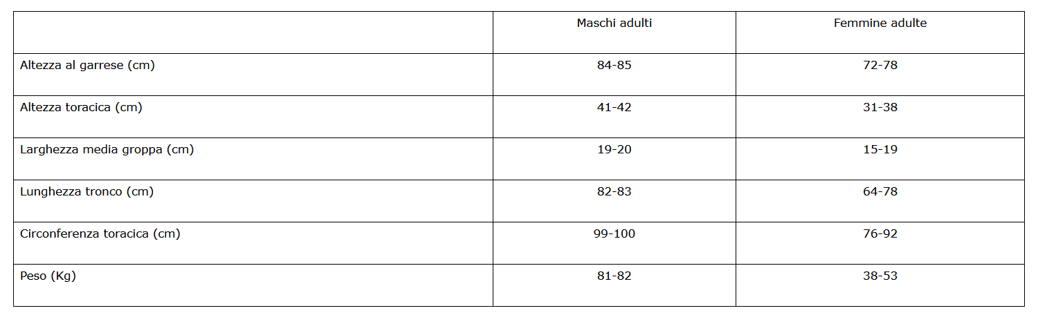 Taglia: medio–grande, le femmine adulte hanno un peso non inferiore ai 45 Kg, mentre i maschi adulti hanno un peso non inferiore ai 75 Kg.