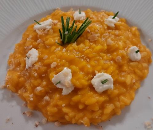 Mentre cuoce il riso, taglia a cubetti piccoli il latteria di capra (a piacere) e schiaccia la zucca arrivando quasi ad avere un purè.