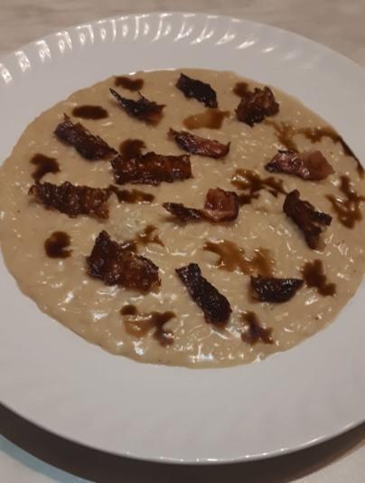 Risotto mantecato con erborinato di capra, bacon e aceto balsamico