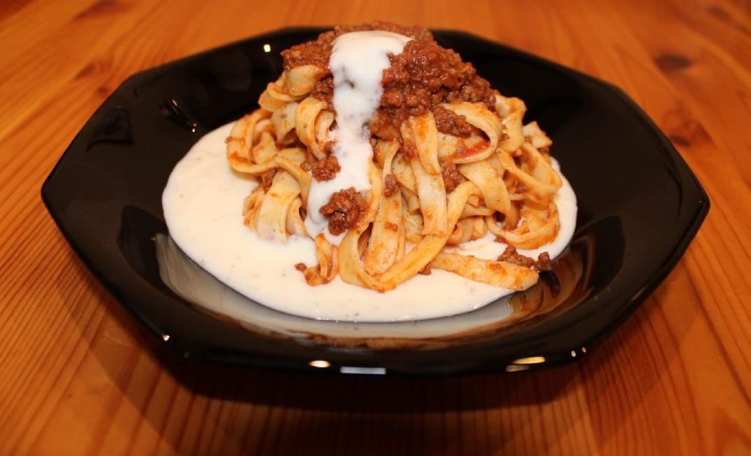 In un piatto fondo versare qualche cucchiaio di besciamella, appoggiare le tagliatelle precedentemente unite al ragù e completare con un cucchiaio di ragù e uno di besciamella.